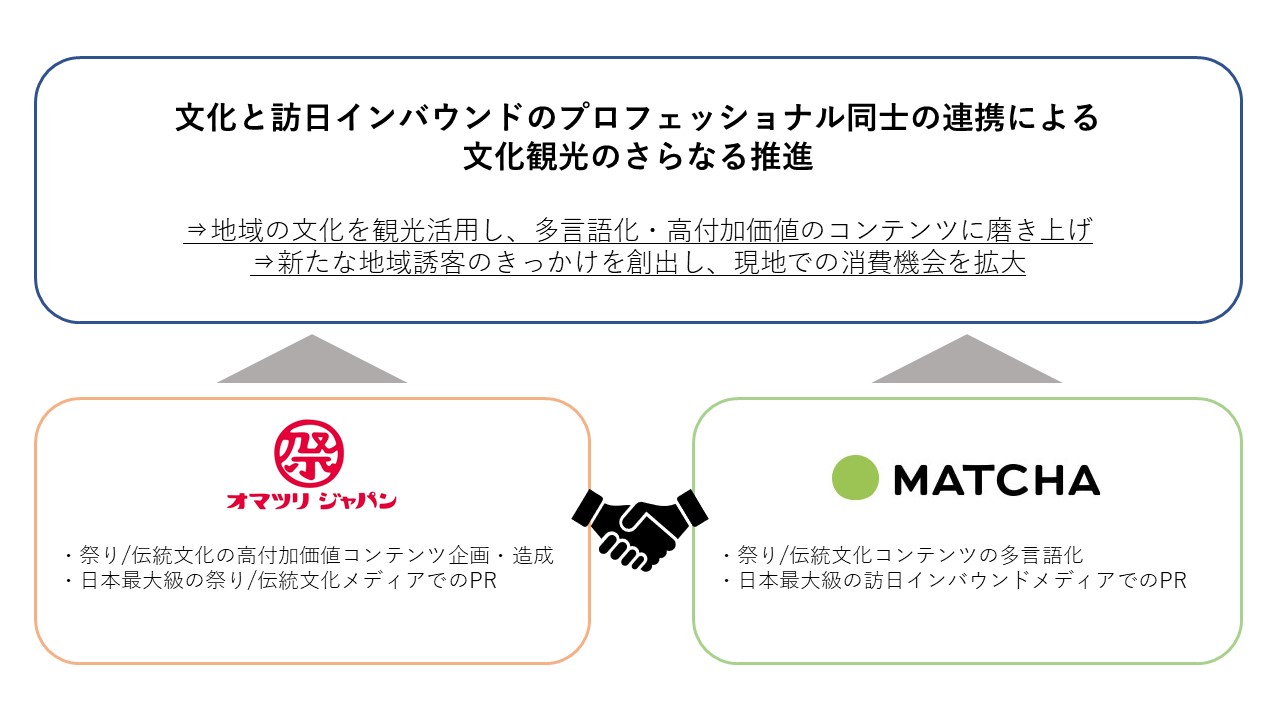 祭り・伝統文化の企画や運営等のサポート事業を行っている専門会社 株式会社オマツリジャパン(代表取締役社長:加藤 優子、本社:東京都渋谷区、以下オマツリジャパン)は、日本最大級の訪日インバウンドメディアを運用する 株式会社MATCHA(代表取締役:青木 優、本社:東京都台東区、以下MATCHA)と本日より業務提携を開始いたします。