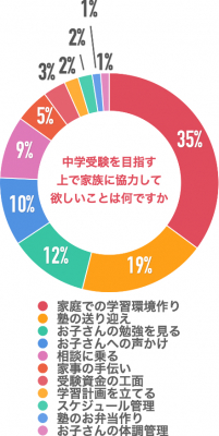 「家庭での学習環境作り」が35%、「塾の送り迎え」が19%「お子さんの勉強を見る」が12%、「お子さんへの声かけ」が10%、「相談に乗る」が9%、「家事の手伝い」が5%、「受験資金の工面」が3%、「学習計画を立てる」が2%、「スケジュール管理」が2%、「塾のお弁当作り」が1%、「お子さんの体調管理」が1%という回答でした。