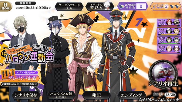 株式会社エレメンツリー(代表取締役:小川 邦弘、所在地:大阪市中央区)は、2021年9月24日にホラーBLゲーム『チギリバコ』(CV.四ツ谷サイダー、鳩マン軍曹etc)新規イベント「Trick yet Treat!強制脱衣!? ハロウィン運動会」の提供を開始しました。