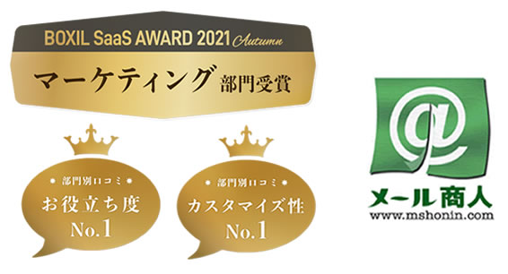 今回の「BOXIL SaaS AWARD 2021 Autumn」では、大賞4サービス、部門別1位14サービス、部門賞225サービス(※2)が選出され、メール商人は利用ユーザーからの高い評価により「マーケティング部門」を受賞する運びとなりました。