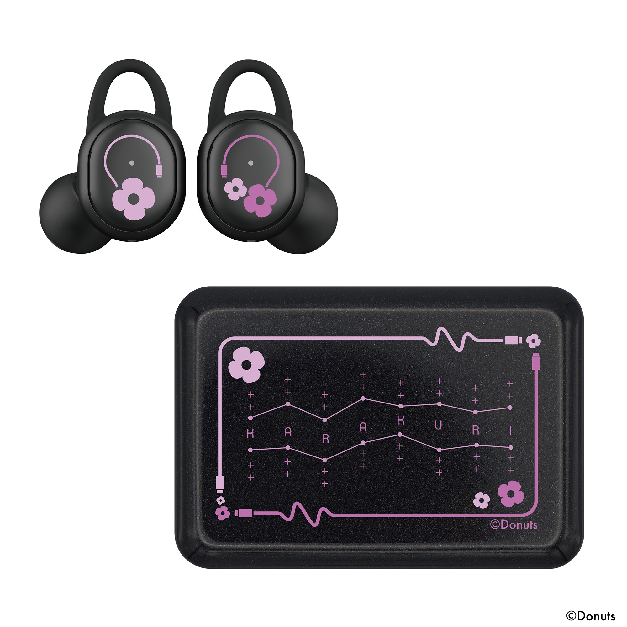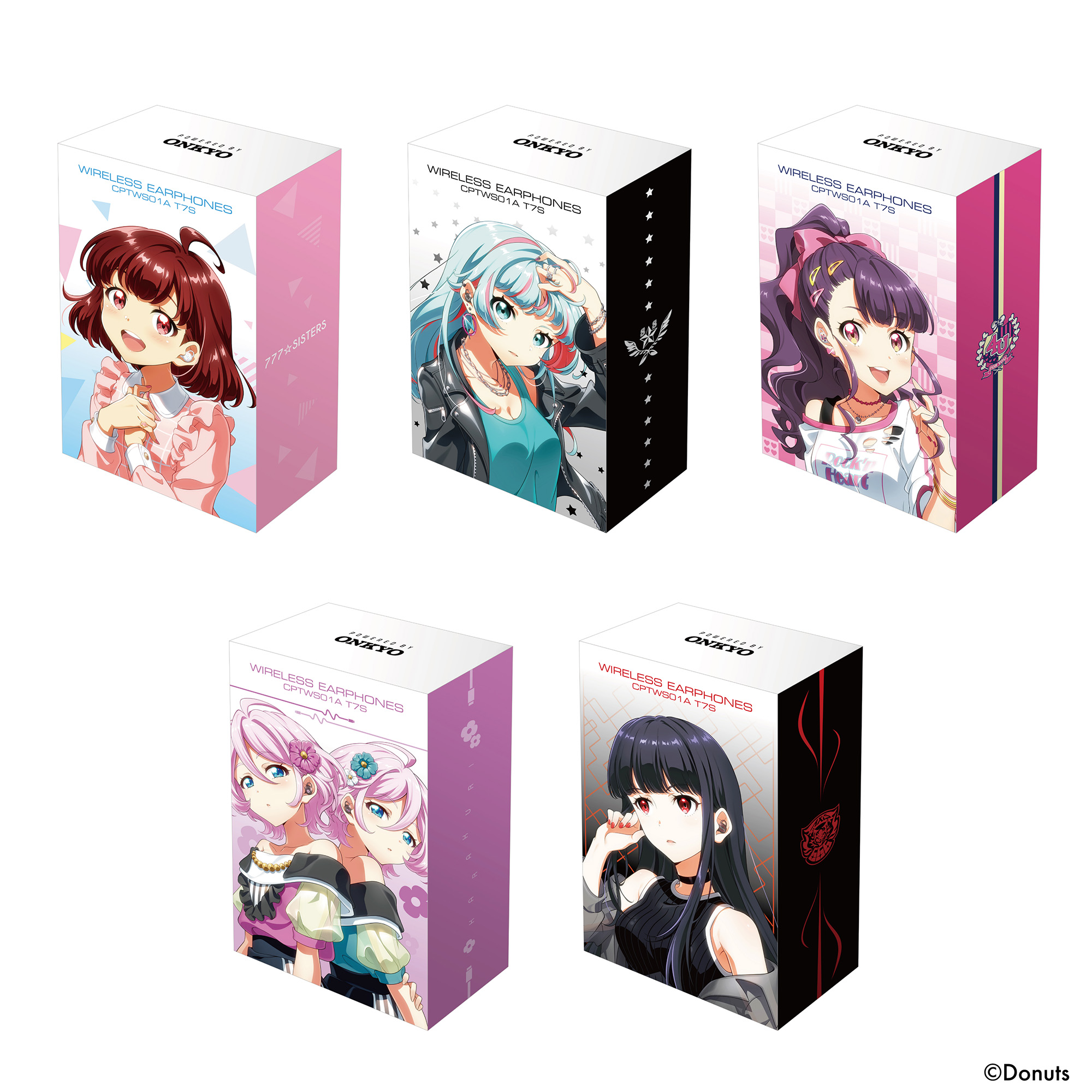 本コラボレーションモデルは、「777☆SISTERS」「セブンスシスターズ」「4U」「KARAKURI」「AXiS」の全5種類展開で左右のハウジング及び、本体充電ケース(天面)に各ユニット名や象徴となるデザインを施し世界観を表現しております。製品パッケージにつきましても「777☆SISTERS」から「春日部ハル」、「セブンスシスターズ」から「七咲ニコル」、「4U」から「九条ウメ」、「KARAKURI」から「空栗ヒトハ/フタバ」、「AXiS」から「天神ネロ」の本コラボレーション用の描き下ろしデザインを採用。特典にはオリジナルワイヤレスイヤホン巾着と各ユニットの描き下ろしデザイン缶バッチ※2が購入者全員についてくる豪華仕様となっております。