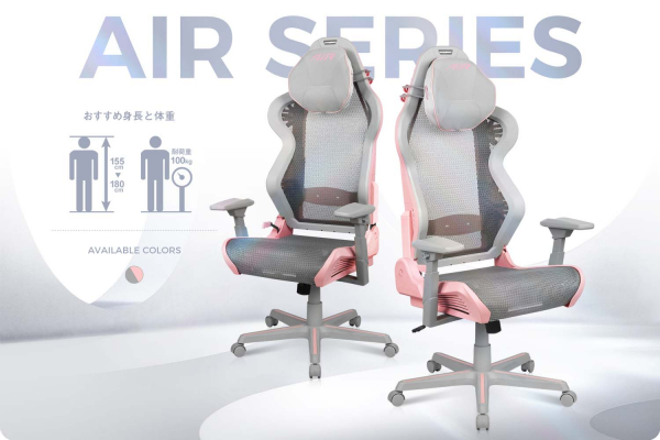 レーシングシートの製造により受け継がれたチェア製造技術をベースに、eSportsプレーヤー向けに初めてゲーミングチェアを製品化したゲーミングチェアパイオニアブランドである“DXRacer”が、曲面の多いレーシングシートタイプの3次元立体成型メタルフレームで構成されるゲーミングチェアの座面、背もたれに初めてエアメッシュを採用。従来の当社製品の特徴である、最大150°のリクライニング機能、ハイスペックなパーツによる高い機能性を踏襲しつつ、最大限の通気性にこだわり開発された、世界初レーシングシート型フルエアメッシュ製ゲーミングチェアが “AIR”シリーズです。