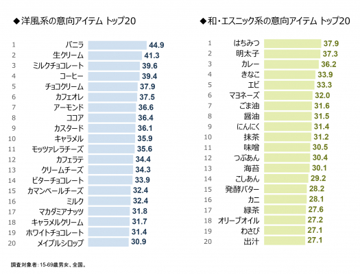 洋風系の108アイテムのなかで、意向が最も高いのは「バニラ」で、2位は乳系の「生クリーム」です。