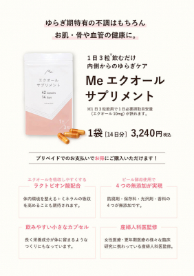 「Me」では、9月から販売開始した「Meエクオールサプリメント」を出展いたします。