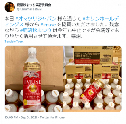 キリンホールディングスが展開する日本初※1の免疫機能の機能性表示食品「iMUSE(イミューズ)」ブランド※2から、「キリン iMUSE(イミューズ) ヨーグルトテイスト」30ケース(720本)の提供をいただき、全国6か所の祭り主催者に配布し、協賛を行いました。(配布期間:2021年9月3日~30日)