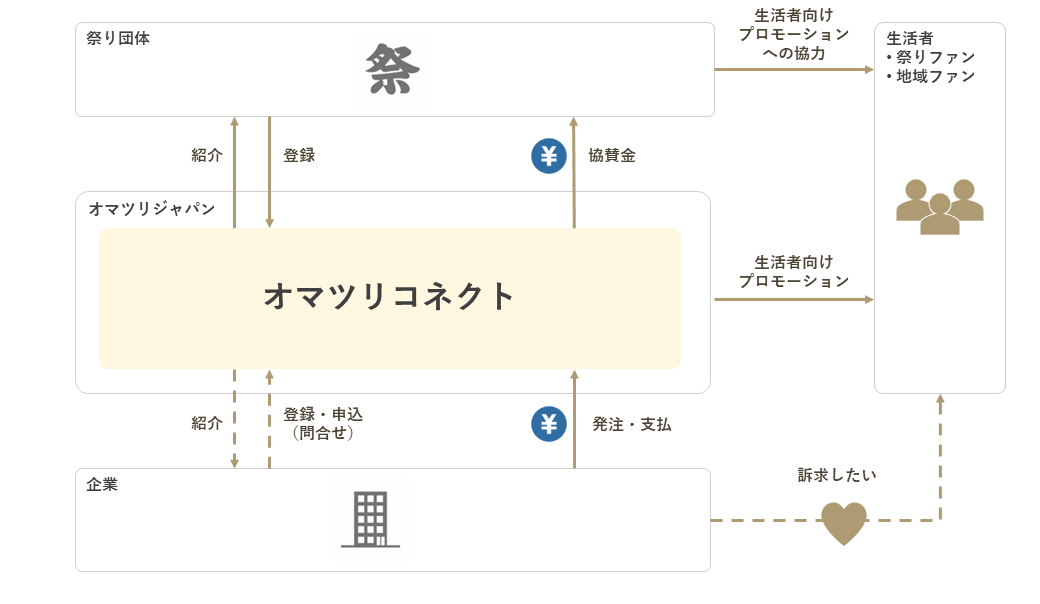 オマツリコネクトとは、全国の祭り主催者に協賛企業を紹介するプラットフォームサービスです。