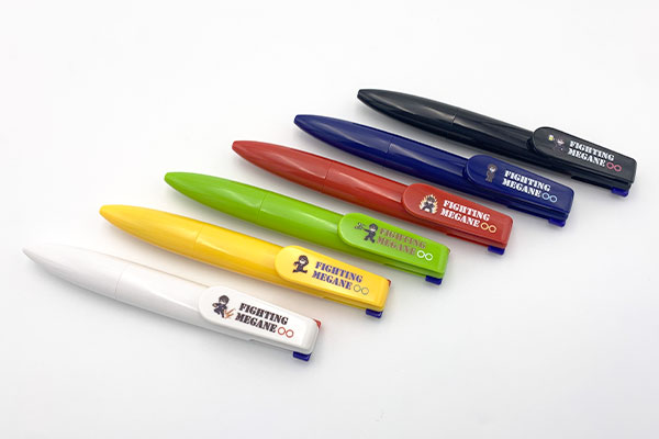 ボディカラーは、レッド・ホワイト・ネイビー・ブラック・イエロー・ライトグリーンの6色展開でご用意しております。企業や商品・ブランドのイメージカラーに合わせてお選びいただけます。普通の販促ボールペンとはちがう形状とプリント範囲で、ノベルティで配っても喜ばれること間違いなしです!