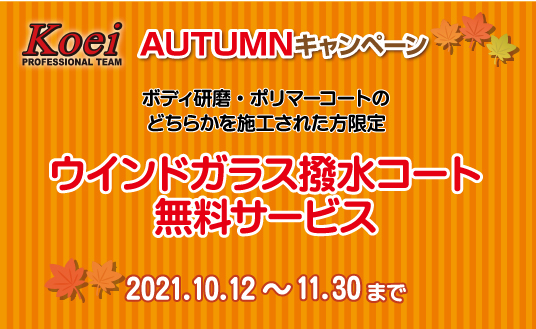 今回の高栄自動車「オータムキャンペーン」は、11月30日(火)までの期間中、大切なお車の美しさをお手軽に維持してくれるボディ研磨やポリマーコートの施工をご注文頂いたお客様に、雨の日もクリーンで安全な視界をキープしてくれる“ウィンドガラス撥水コート(\3,300~相当)”を無料サービスする、大変お得なキャンペーンです。