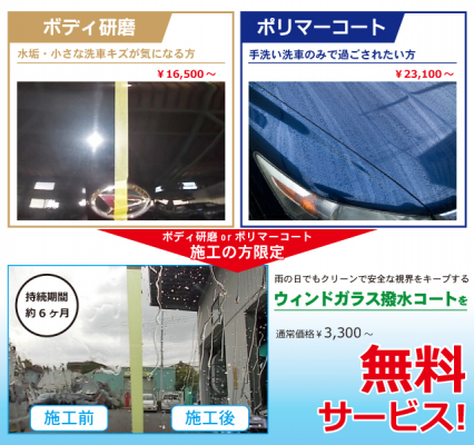 ※“ウィンドガラス撥水コート”は、「ボディ研磨」や「ポリマーコート」施工時に行います