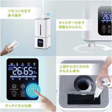 3段階の噴霧量・キャスター付き・リモコン付き等の様々な機能があるほか、家庭用・業務用どちらでも使用が可能な、ハイクオリティな加湿器です。