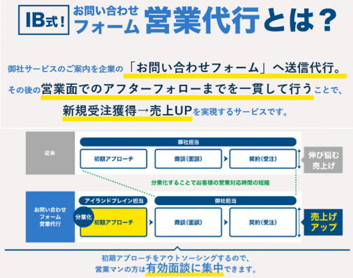 そこで今回は営業代行サービスを17年間、2500社に展開する(株)アイランド・ブレインはからインサイドセールスサービスである「IB式お問い合わせフォーム営業代行」を紹介します。