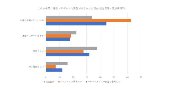 スポーツ庁の調査によると、20~40歳代の子育て中の女性の運動・スポーツの実施意向が低い理由として下記のような声が上がっています。