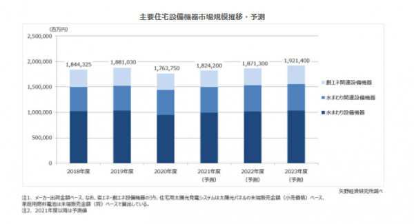 2021年度の主要住宅設備機器の市場規模(水まわり設備機器+水まわり関連設備機器+創エネ関連設備機器の合計値)は、前年度比3.4%増の1兆8,242億円になると予測する。