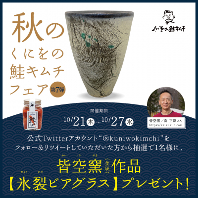 「秋のくにをの鮭キムチフェア」今回の第7弾は、10/21(木)~10/27(水)の期間中に、くにをの鮭キムチ公式Twitterアカウントフォロー&リツイートいただいた方の中から抽選で1名様に、皆空窯(かいくうがま-美瑛町)作品の中から代表作の氷裂(ひょうれつ)ビアグラス(16,000円相当)をプレゼントいたします。