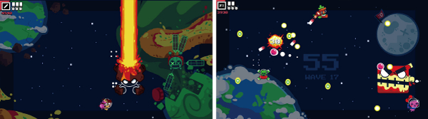 ステージは全部で7つ。次のステージに飛ぶためには約90秒宇宙エンジンをチャージさせる必要があります。その間、敵から自分の身を守り、ボスを倒しましょう!