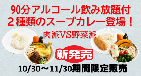 有限会社マジカルエッグ(本社:東京都足立区)が運営する墨田区で唯一のスープカレー専門店の『お江戸スープカレーちゃはや庵』(所在地:東京都墨田区)は10月30日(土)~11月30日(火)までの期間アルコール90分飲み放題付き「肉派VS野菜派」の2種類のスープカレーを新発売します。スープカレーをつまみながらアルコールを嗜むチャンス。アルコールはソフトドリンクも可能です。