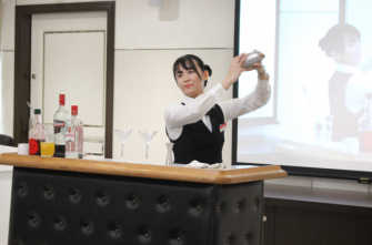フルーツカービング部門とカクテル部門に分かれて実施する料飲コンテストは今年で5回目。有名ホテルで活躍する料飲サービスのスペシャリストの前で予選を勝ち抜いたファイナリストたちが決められた時間内でゲストの心をつかむ技を披露します。学生にとっては授業で学んだことをプロの前で披露できる貴重な機会となります。