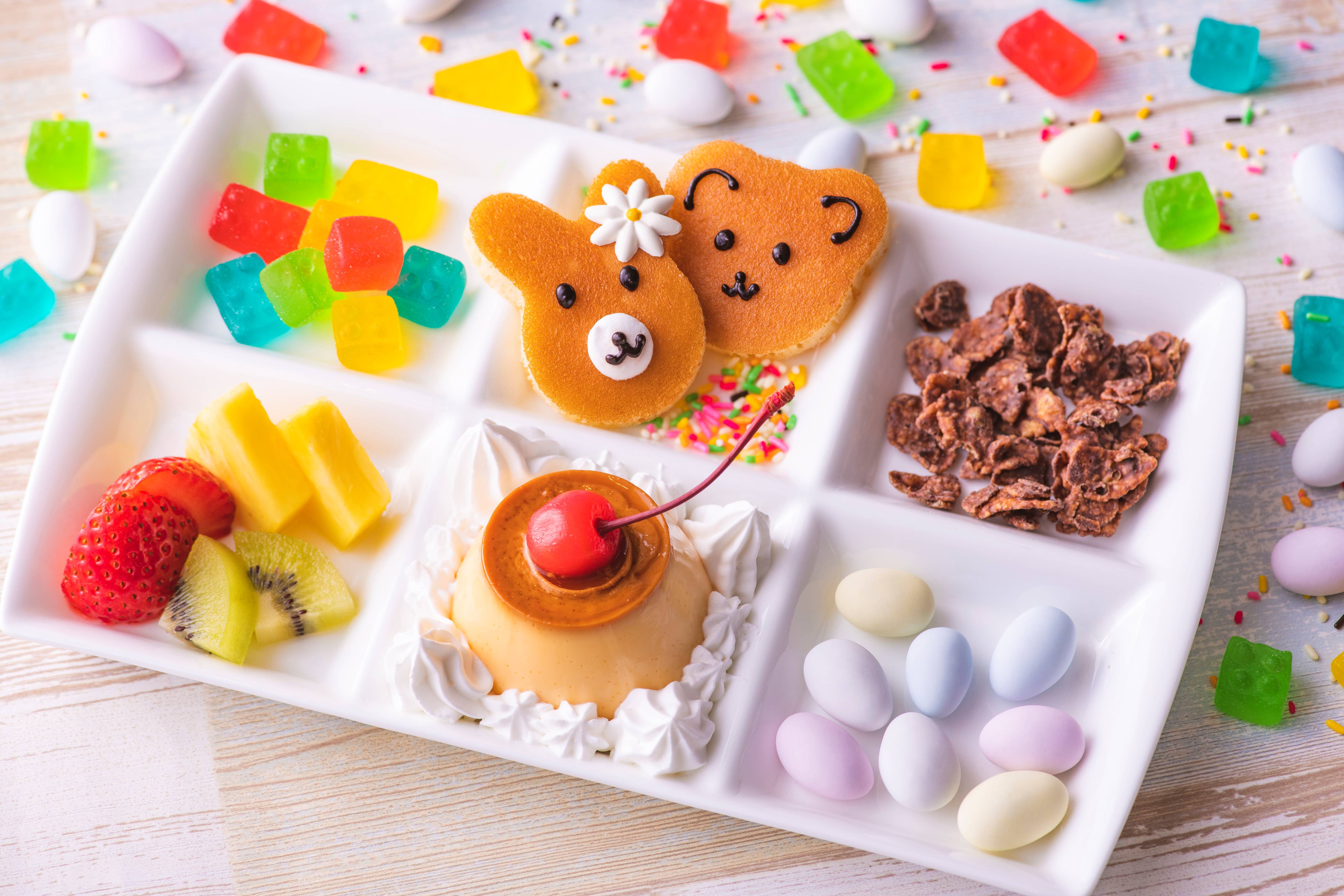 まるでプレゼントボックスのように、ピンク色の大きなチョコレートリボンをデコレーションしたペストリーシェフ特製オリジナルケーキや、誕生石をイメージした12色のバルーンカクテルが、アニバーサリーメニューのオプションとして大切な記念日を彩ります。その他お子様連れのご家族にもぴったりな、わくわく楽しいオリジナルキッズメニューもご用意しています。