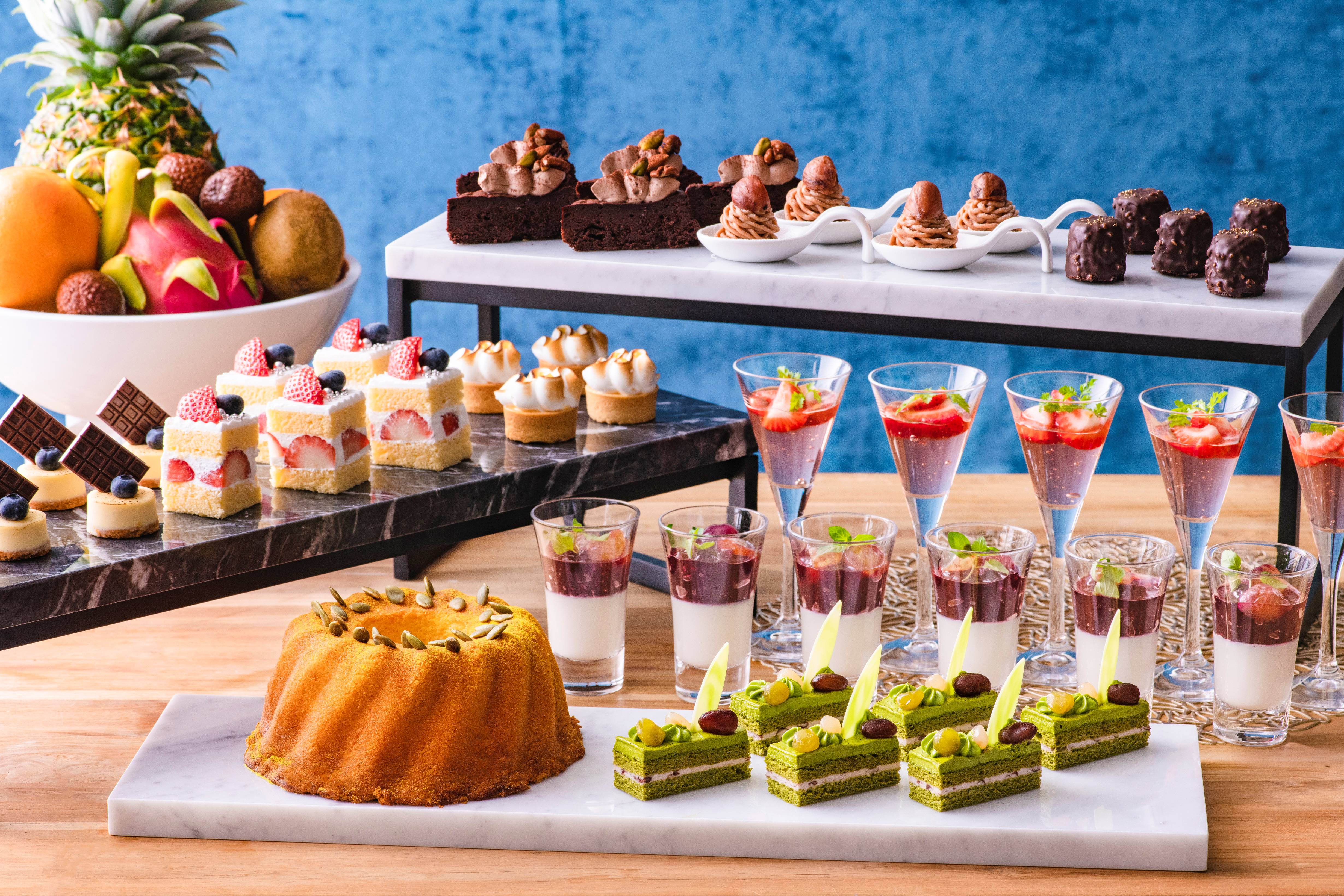 ビュッフェカウンターに入ると、目で、香りで、音で、楽しんでいただける、旬の食材を使用したシェフのオリジナリティあふれる料理が並びます。ライブステーションには、シェフが鉄板で焼き上げる肉汁たっぷりの国産牛100%の粗挽きハンバーグや、大きなパルメザンチーズホールに絡めて仕上げる生パスタなど、食欲をそそるメニューの数々を提供いたします。低温でじっくり加熱した柔らかいローストビーフや、インド人シェフこだわりの本格インドカレーなど、定番メニューも堪能いただけます。