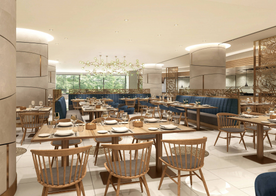 デザインコンセプトは「Monsoon Forest」。リゾート地に佇むヴィラの広大な庭をイメージしたフォレストガーデンは、アジアの風が吹き抜ける森の中にいるようなリラックスできる空間です。自然な色合いのオーク材と、ディープブルー(深い海の青)とフォレストグリーン(くすんだ青みのある緑)を使用したナチュラルなファブリックに、「葉」や「幹」をモチーフとしたモダンでスタイリッシュなガラスシャンデリアを加えました。太陽光が差し込む吹き抜けの空間に設置した「森の木漏れ日」をモチーフとした巨大な木製アートは、新しいシンボルです。