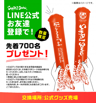 スティックバルーンについては、SAMURAI SONIC公式LINEのお友達登録をして下さった方に先着で無料プレゼントの企画を実施いたします。(予告なしに内容が変更になる可能性がございます。)