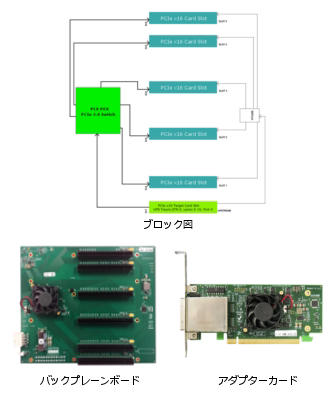 ホストシステムのPCIe3.0(X16)バスに接続されたケーブルアダプターと、ダブルスロットカード対応のPCIe 3.0(X16)バス5本を備えた拡張バックプレーンとを、128Gbps対応の双方向バス拡張ケーブルで接続して汎用PCやサーバのPCIeバスを拡張します。