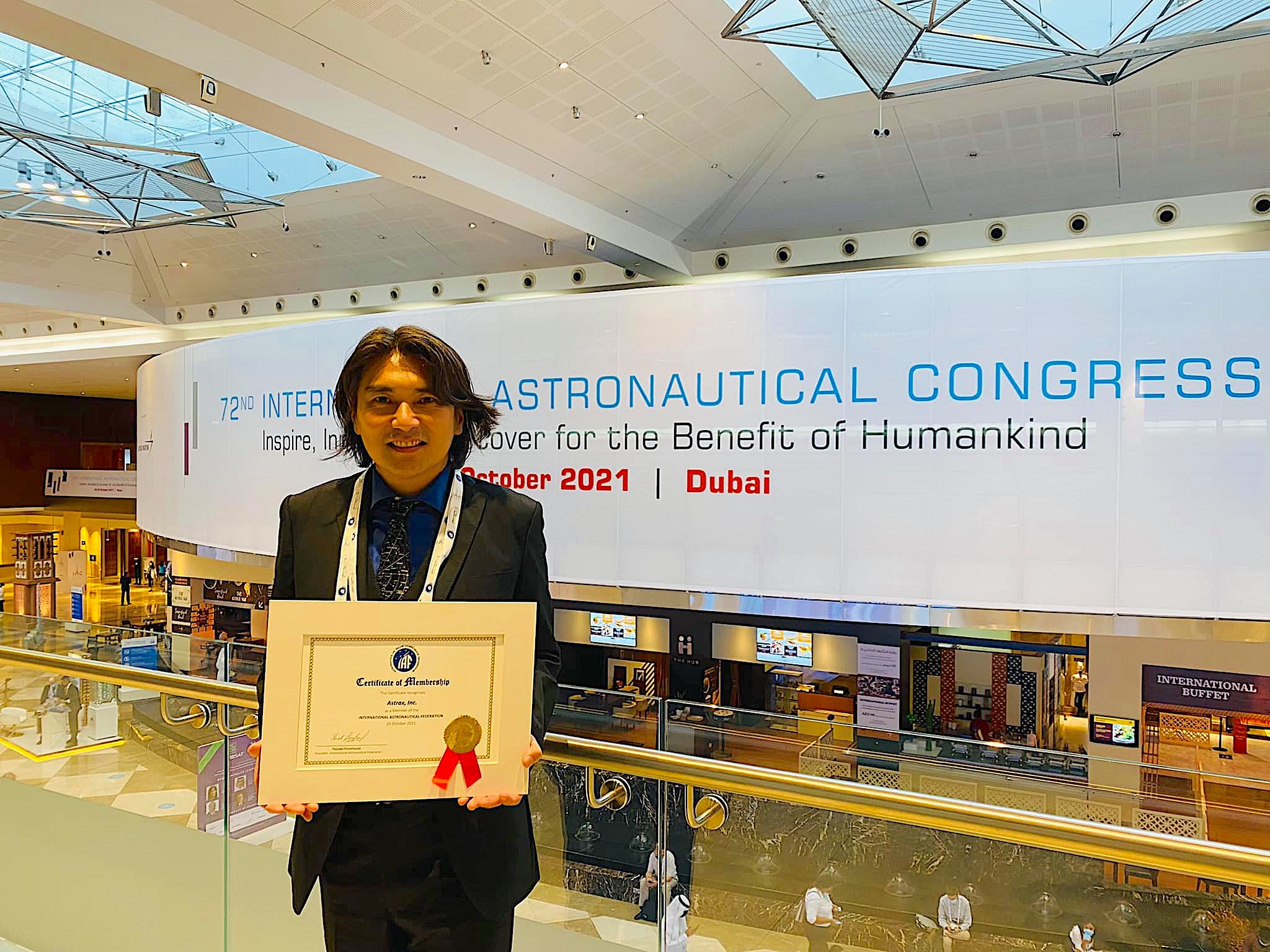 人々の夢を宇宙で実現させる民間宇宙サービスプラットフォームを提供する宇宙ベンチャー企業、株式会社ASTRAX(アストラックス、以下 ASTRAX、本社:神奈川県鎌倉市、代表:代表取締役・民間宇宙飛行士 山崎大地)は、2021年10月25日から29日までアラブ首長国連邦のドバイのワールドトレードセンターで開催された世界最大の宇宙業界の国際会議「第72回国際宇宙会議(IAC 2021)」の会期中、2021年10月25日に行われた国際宇宙航行連盟(IAF)総会において、国際宇宙会議の主催者である国際宇宙航行連盟(IAF)のメンバーとして正式に承認されましたので報告いたします。