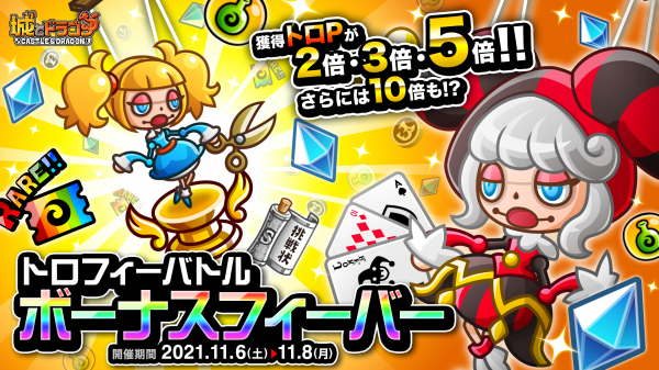 株式会社アソビズム(本社:東京都千代田区、代表取締役:大手智之)は、App Store・Google Playにて好評配信中の『城とドラゴン』で、「トロフィーバトル ボーナスフィーバー」を2021年11月6日(土)より開催いたします。