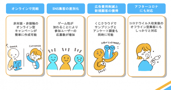 コロナウイルスにより客数が減少している飲食店様や百貨店様、イベント会場などで集客企画の一つとしてご利用いただけます。