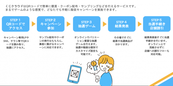 くじクラウドはオンラインで行える抽選くじです。懸賞・クーポン配布・サンプリングなど、ゲーム感覚で販促イベントを実施できます。