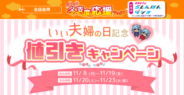 らしんばんでは、オタクらしく“推し”と一緒に「いい夫婦の日」を楽しんでいただきたいという想いから、「いい夫婦の日記念 値引きキャンペーン」を実施いたします。