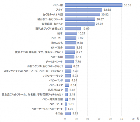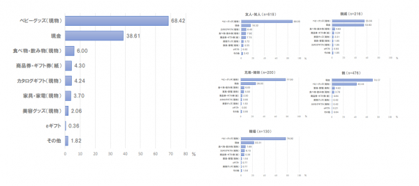 ベビー服がもっとも贈られる点は全体の結果と同じであるが、ベビーカーやベビー布団、チャイルドシートなどの大型商品や高額商品が上位にくるという結果がおもしろい。