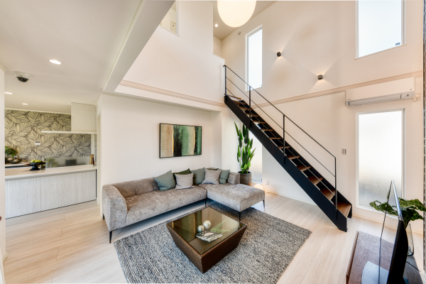リビングは玄関から最も近い位置に設計。シースルー階段、縦に伸びた吹き抜け空間や間接照明付エコカラット+(プラス)を設けることで開放感・プレミアム感を演出し、日常を忘れて過ごせるリゾート空間をイメージしています。
