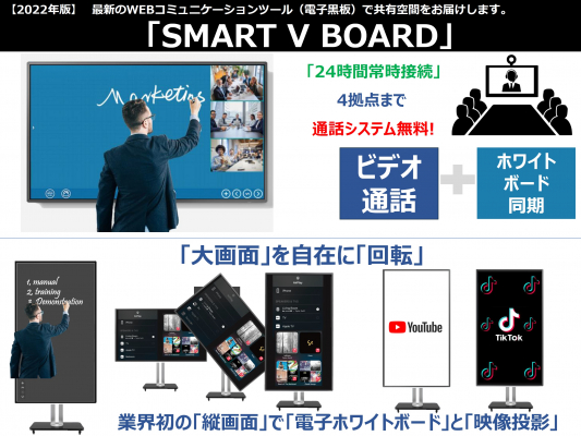 情報コミュニケーションツール&電子黒板機能搭載、【2022年版】最新版 「Smart V Board」は拠点間を「24時間 繋ぎっぱなしビデオ通話」+「ホワイトボード同期」が可能。コミュニケーションや、何時でも直ぐ会議ができるWith コロナ時代の「空間共有」をお届けします。