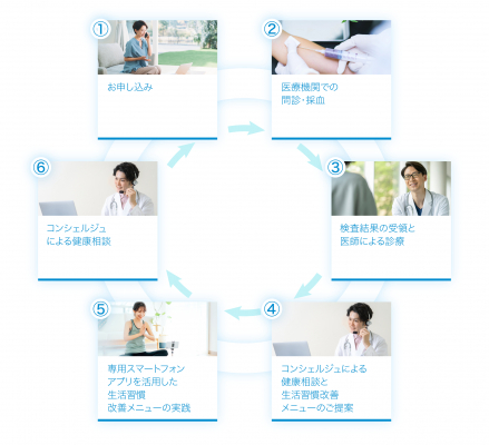今と将来の健康が可視化された検査結果報告書と検査ガイドは、受診した医療機関の医師との健康相談に活用することができます。さらに、保健師の資格を持つフォーネスビジュアスコンシェルジュによるカウンセリングで、生活習慣の改善メニューを提示します。その後、検査を受けたすべての方が利用できる「生活習慣の改善をサポートするスマホアプリ」を通じて、改善メニューの実践を支援します。定期的な検査のご利用とあわせて、健康意識の維持、向上にご活用ください。