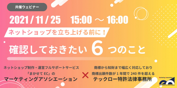 ECサイト・ネットショップの制作・運営フルサポートサービスを提供しているマーケティングアソシエーション株式会社(本社:東京都台東区 代表取締役:相内あゆ美、以下マーケティングアソシエーション)は、テックロー特許法律事務所(本社:東京都千代田区 代表弁理士:亀卦川巧、以下テックロー)と、2021年11月25日(木)に無料Webセミナー「ネットショップを立ち上げる前に!確認しておきたい6つのこと」を共催いたします。