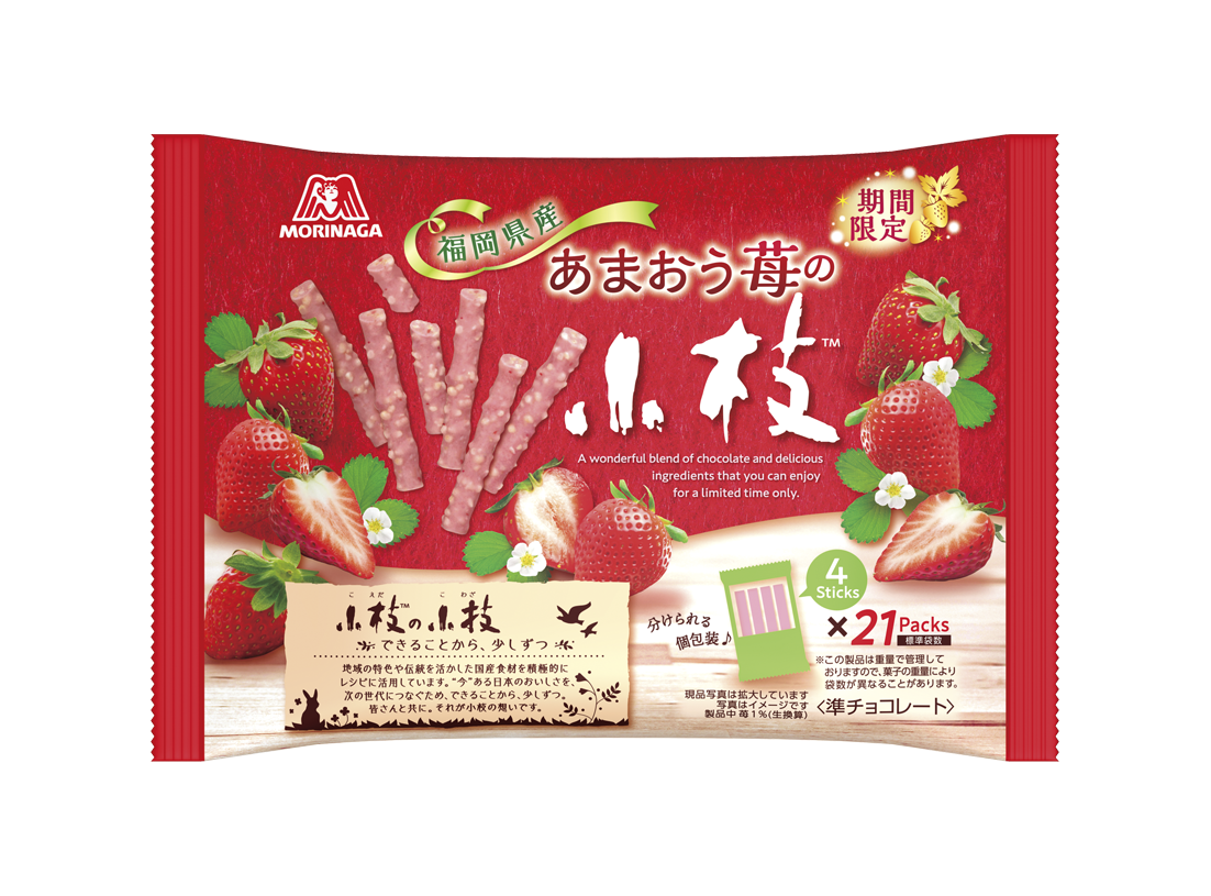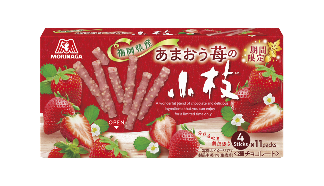 苺フレーバー菓子は、毎年期間限定で発売しており、安定した人気でご好評をいただいています。今年は、苺の王様と言われる『あまおう苺』とコラボレーションした「小枝」やケーキ、甘酸っぱくフレッシュな苺の風味が口いっぱいに広がる「エンゼルパイ」など、様々な苺のお菓子を取り揃え店頭を盛り上げてまいります。