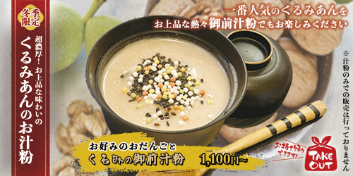 ~お上品な味わいの一番人気くるみあんを熱々”御前汁粉”で~