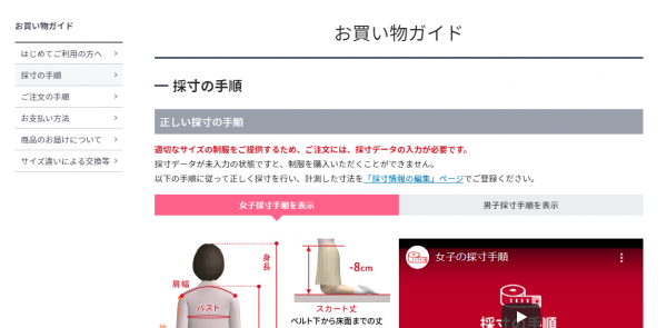 個別に発行・配布されるID・パスワードにより専用Webサイトにログインすることで、学生服のサイズ選択に必要な採寸箇所と、その採寸方法・ポイントをまとめた採寸動画の閲覧が可能。動画を見ながら、場所や時間を選ばずに自宅などで採寸を行ない、採寸情報をシステム上に登録できます。三密を回避しながら、安心して採寸を行なうことが可能です。