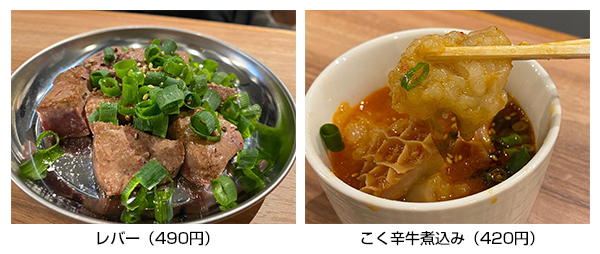 高鮮度なレバー・ミノ(各490円、以下金額はすべて税込価格)をはじめ、別名大トロホルモンとも呼ばれるジューシーなキクアブラ、脂が少なく旨味の強いコメカミなどホルモン好きも納得のメニューを390円の低価格で提供。熱が均一に伝わる鉄板で焼くことで、国産ホルモンの旨味を最大限お楽しみいただけます。