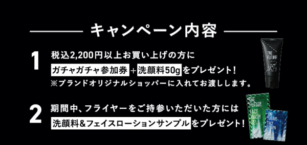 期間中は、税込2,200円以上お買い上げの方全員にオリジナルショッパーと洗顔料ミニサイズ(50g)のプレゼントを実施します。さらに、スキンケアセットなど豪華景品の当たるガチャガチャにご参加いただけます。