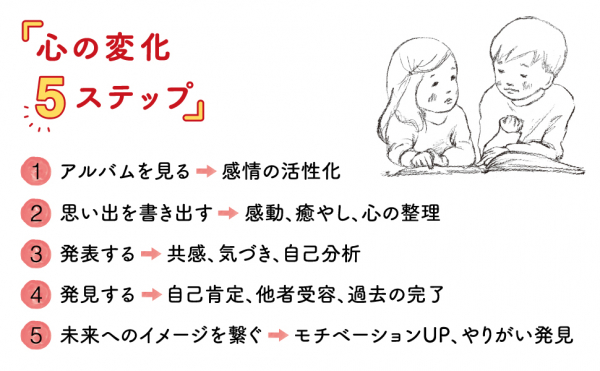 アルバムを使って過去を振り返り、忘れていた過去の記憶や思い出から