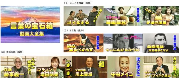 メインチャンネルの人気コーナー「言葉の散歩道」を、シニアに限定せず、老若男女向けの名言・ことわざ・ 座右の銘を加え楽しくわかり易く紹介、「コントで学ぶことわざ図鑑」「名言集」「座右の銘」の3カテゴリ―を展開。