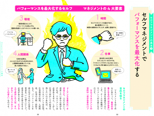 本書はセルフマネジメント、チームマネジメントを中心に構成し、特別なイラストを配置することで、周辺の文字や図解を見るだけでマネジメントの内容がわかります。また、コロナ禍で必要なマネジメントスキルなど、これからのビジネスパーソンに欠かせない情報が盛りだくさんです。