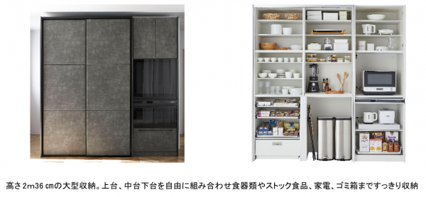 リビングから見える背面収納も、食器や家電で雑多に見えがち。突然のお客様にも、大型扉をサッと閉じれば、すぐに隠して キレイな空間に。キッチン面材の扉で、空間をトータルコーディネートできます。