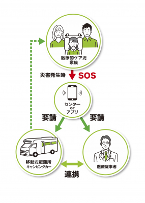 避難を希望する医ケア児家族と衛生面・プライバシーと電源確保が可能なキャンピングカーをマッチングするシステムです。事前に登録した個別避難計画書『イッツミー』を医師・看護師ネットワークと連携することで、医療従事者のサポートを受けることも可能となります。
