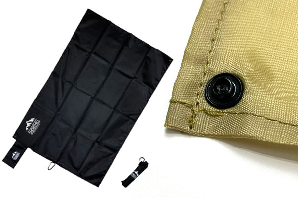 シートは、60×90cmで1~2人向けにちょうどいいサイズです。四隅にスナップボタンが付いているので、シート同士を連結させて少し大きめのピクニックシートにすることも可能です。シートにはカラビナも付いているので、丸めてコンパクトに畳んで、リュックやベルトにつけて持ち運びにも便利です。