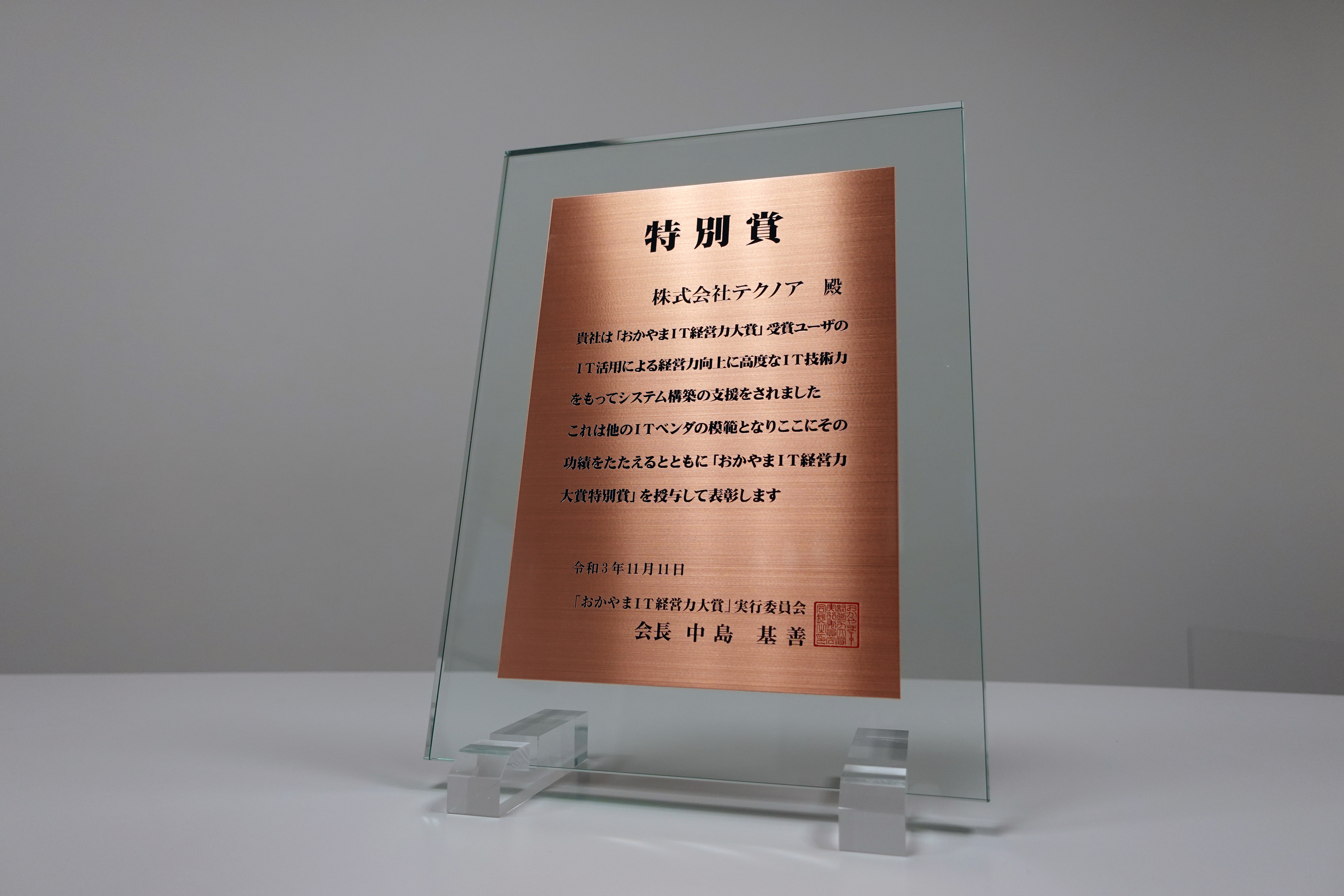 株式会社テクノア(本社:岐阜県岐阜市、代表取締役:山﨑 耕治)は、「おかやまIT経営力大賞」実行委員会の主催する、令和3年度「おかやまIT経営力大賞」にて、「優秀賞」を受賞したお客様へのシステム提供と、サポートに尽力したことが評価され「特別賞」を受賞しました。