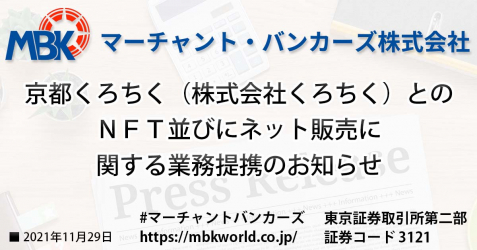 マーチャント・バンカーズ株式会社の子会社MBKブロックチェーン株式会社は、京都の伝統工芸品や和雑貨の制作販売を行う株式会社くろちくとの間で、本日付で、NFT並びにネット販売に関する業務提携につきまして、合意いたしましたので、お知らせいたします。