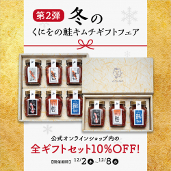 「冬のくにをの鮭キムチギフトフェア」を開催。 今回の第2弾は12/2(木)~12/8(水)まで公式オンラインショップでギフトセットシリーズを10%OFF(税別、送料別)にて販売いたします。